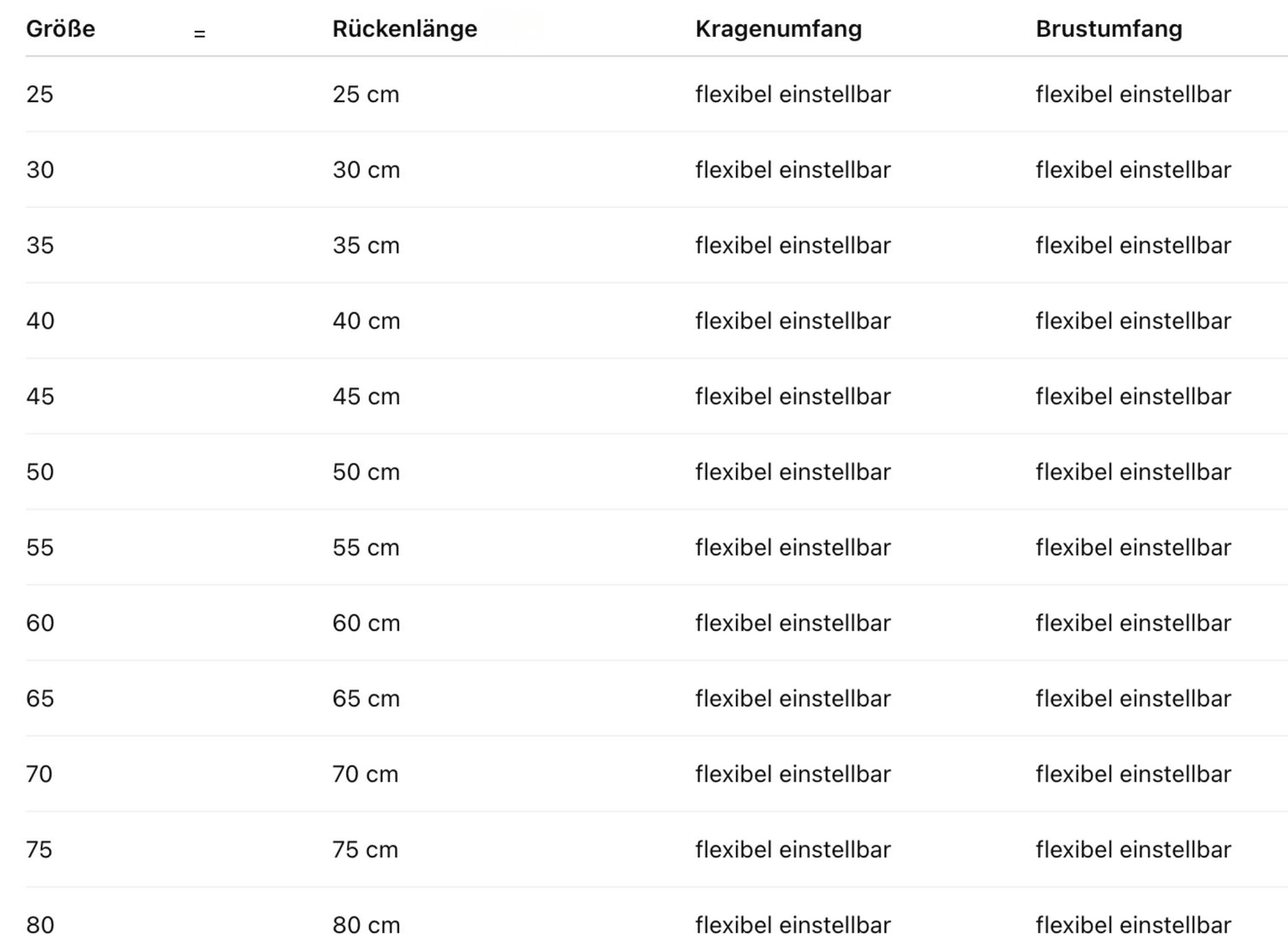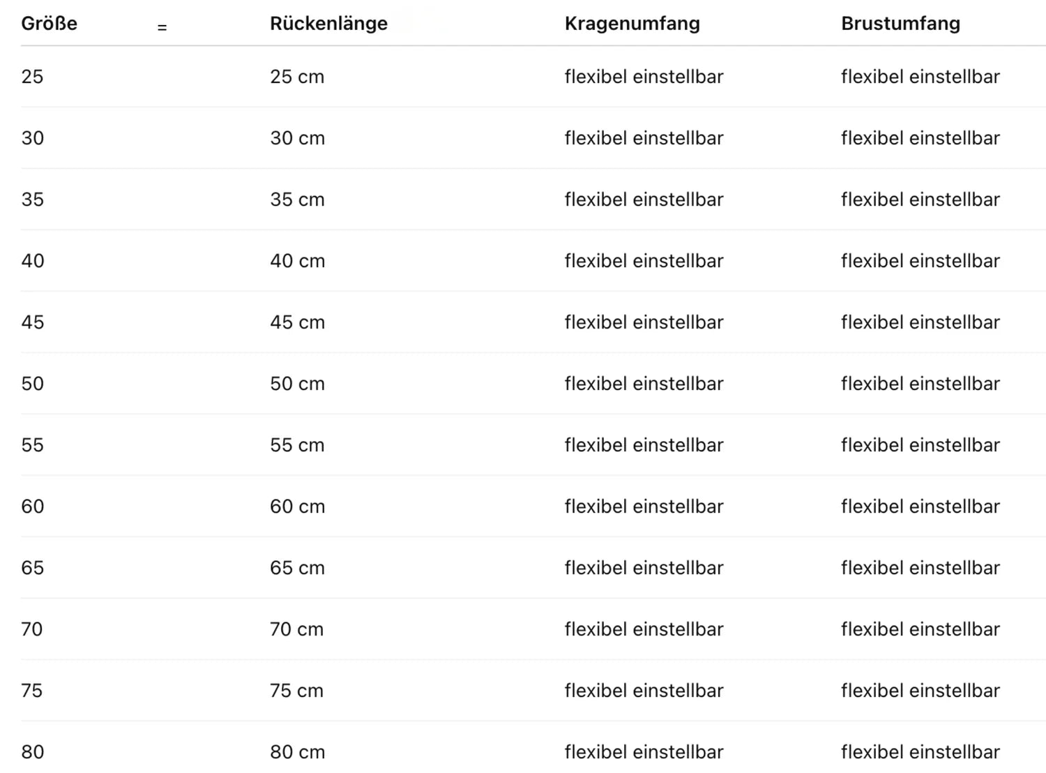 | Größe | Rückenlänge | Kragenumfang | Brustumfang |