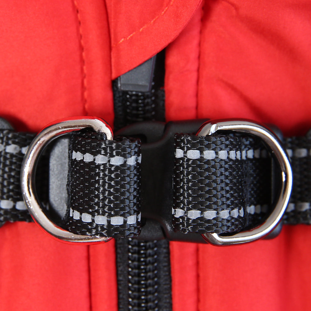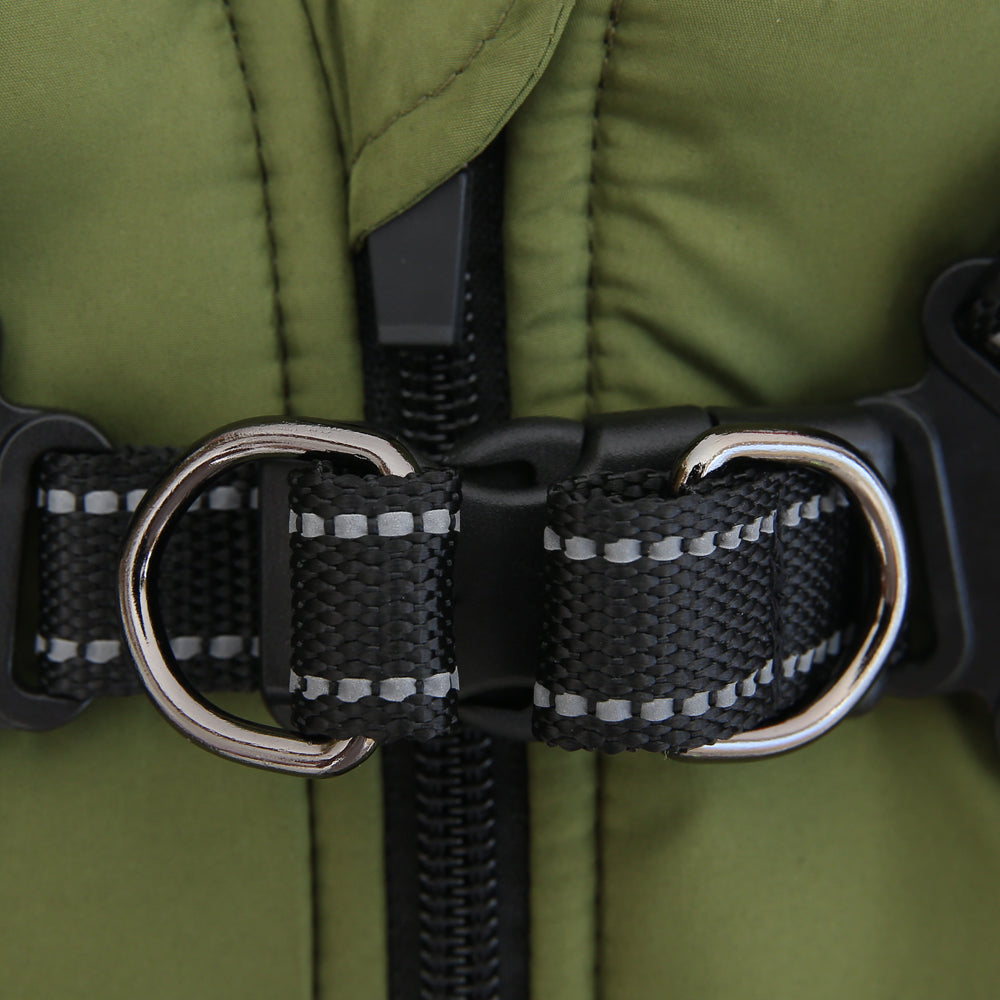 Ein besonderes Highlight ist das eingebaute Geschirr aus robustem, reißfestem Material, das dir maximale Sicherheit bietet. Einfach die Leine einhaken und los – ohne zusätzliches Geschirr über den Mantel ziehen zu müssen.